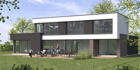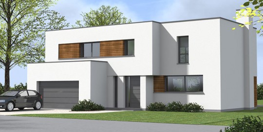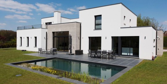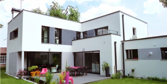 2017-08-31T19:43:19+02:00Mélange de matières : enduit blanc, gris foncé, et briques grises. Grandes baies vitrées coulissantes, ouvrant sur un jardin sans vis à vis.